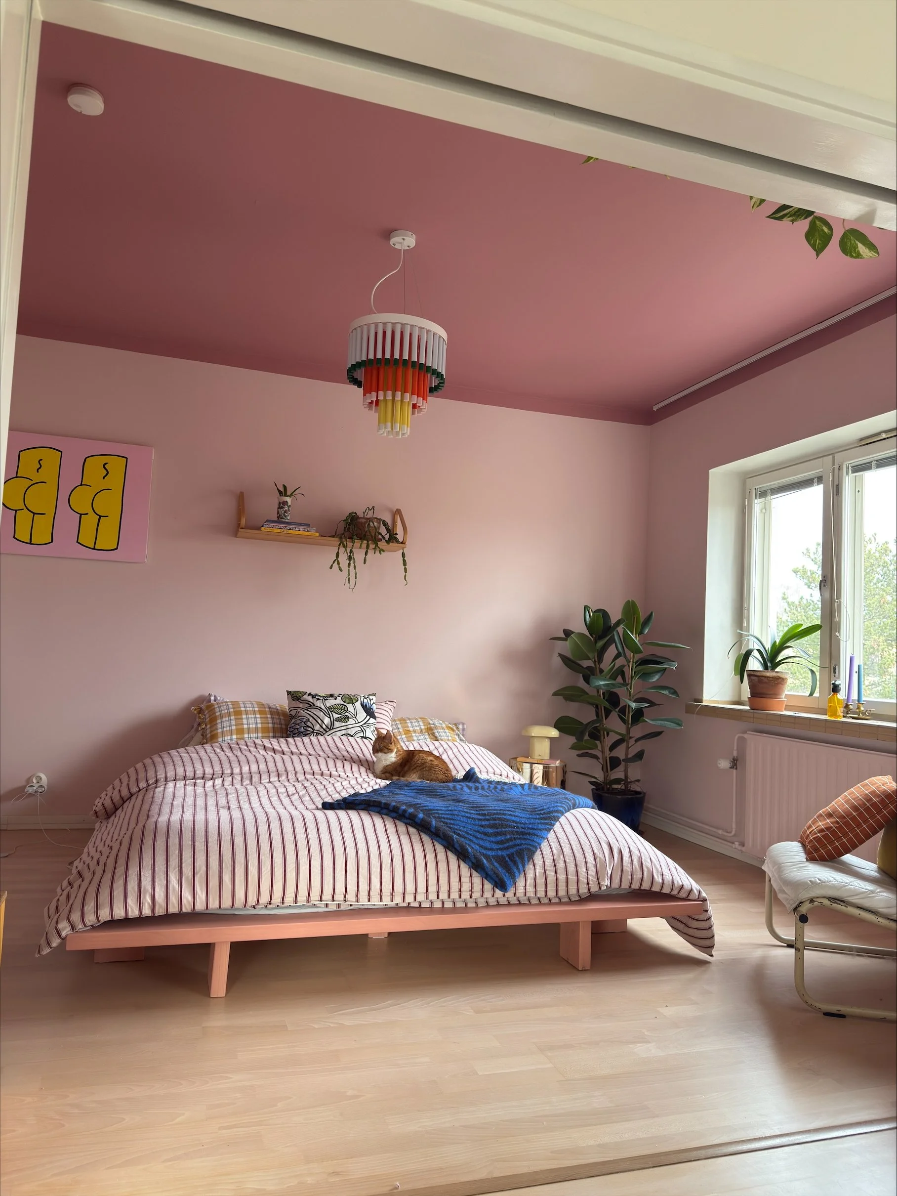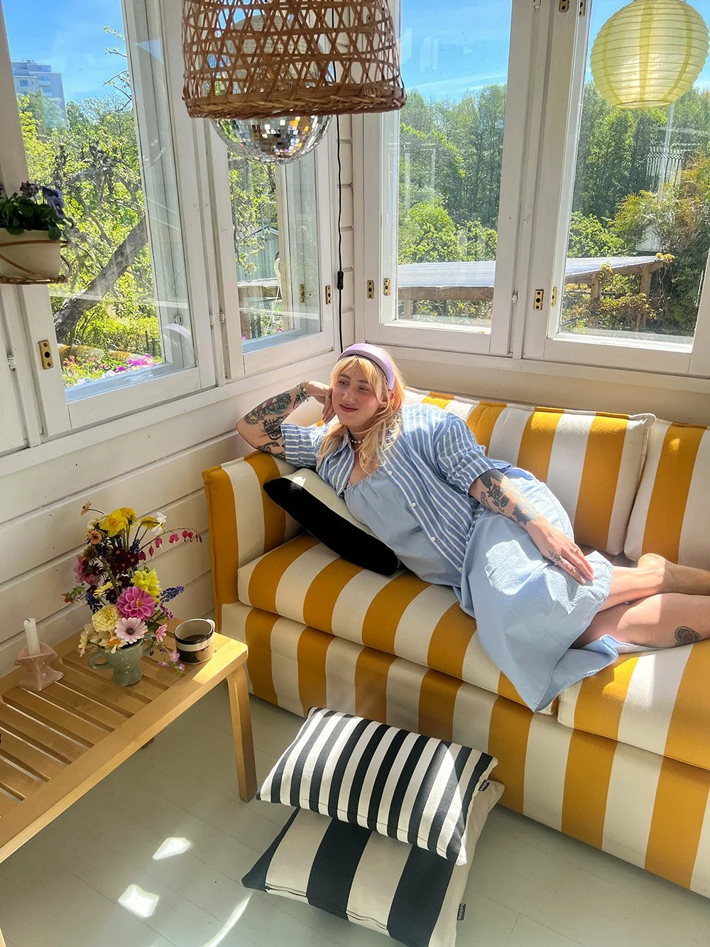 Yhteistyössä tuotiin esiin Hakolan raidallista Filippa-vuodesohvaa, joka muuntautuu täydellisesti siirtolapuutarhamökin yövieraiden makuupaikaksi.